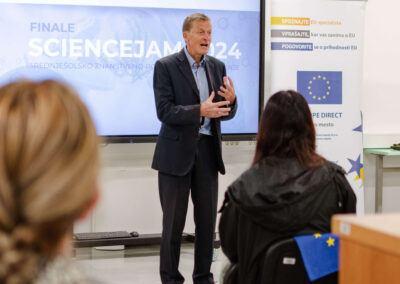 ScienceJam mlade spodbuja k študiju znanosti in tehnologije ter odpirata vrata zelenim in digitalnim delovnim mestom prihodnosti, tako gradimo tudi močnejšo in odpornejšo EU. Tekmovalce je nagovoril dr. Zoran Stančič, svetovalec predsednice republike za evropske zadeve, ki je mladim svetoval kako se pravilno odločati na življenjski poti raziskovalca in inovatorja.