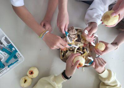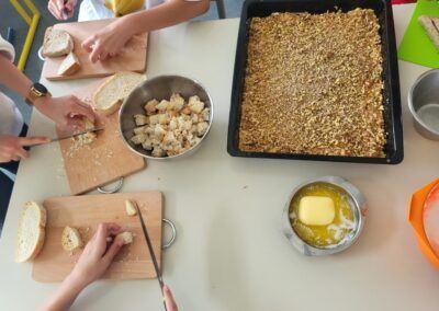 Učenci so iz zrelih banan in suhega kruha pripravili dva preprosta, a okusna obroka. Ob tem so skozi pogovor in praktično delo spoznavali, zakaj je pomembno, da hrano porabimo premišljeno in kako lahko tudi doma preprečimo nastanek odpadkov. Skozi delavnico so bile predstavljene vsebine Evropskega zelenega dogovora, ki med drugim poudarja pomen zmanjševanja količine zavržene hrane, trajnostnega prehranskega sistema in odgovornega ravnanja z viri. Skupaj lahko prispevamo k majhnim, a pomembnim korakom k zeleni prihodnosti.